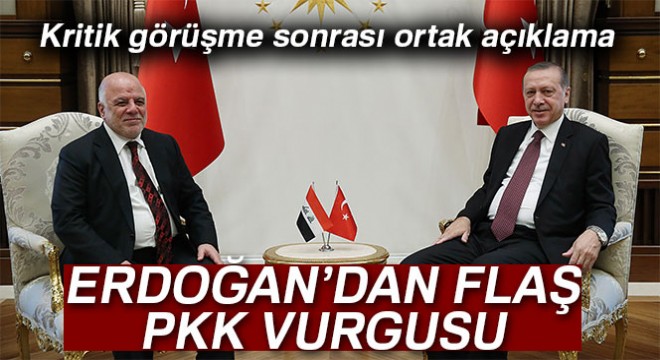 Cumhurbaşkanlığı Külliyesinde Irak Başbakanı İbadi ile yaptığı baş başa ve heyetler arası görüşme sonrasında düzenlenen ortak açıklamada konuşan Cumhurbaşkanı Erdoğan, Irak’ta yapılanması olan PKK’ya karşı Türkiye’nin her türlü dayanışma içinde ortak mücadele sürdürmeye hazır olduğunu söyledi.