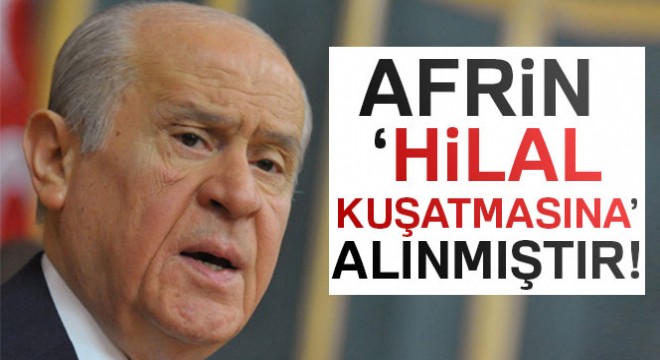 Afrin’de, Türkiye’nin bekası, tarihi ve egemenlik haklarının cesurca müdafaa edildiğini belirten Bahçeli, "Bundan dönüş yoktur, gerçekten de gemiler yanmıştır. Zeytin Dalı Harekatı meşrudur, haklıdır, karşımızdaki muhasım odaklar, müstevli oluşumlar insanlığın yüz karaları, yeryüzünün şeytan işbirlikçileridir. Afrin zorlu bir coğrafyaya sahip, iklim şartları ise mücadelenin aleyhinedir. Buna rağmen, Allah’a çok şükür, adım adım PKK/PYD/YPG terör örgütlerinin sınırlarımızla bağlantısı kesilmiş, sonuç itibariyle Afrin hilal kuşatmasına alınmıştır. Afrin’in stratejik noktaları olan Güney Batıdaki Cinderes, Batıdaki Raco, Kuzeydeki Bülbül bölgelerinde kurulan üslerden teröristlerin gizlendikleri her alan insansız hava araçlarıyla tespit edilip topçu bataryalarıyla vurulmaktadır" açıklamasını yaptı.