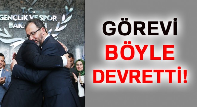 Eski Bakan Osman Aşkın Bak, Gençlik ve Spor Bakanı Mehmet Muharrem Kasapoğlu'nu kapıda karşılarken, devir teslim sonrasında Kasapoğlu da Bak'ı kapıya kadar uğurlayarak yolcu etti.