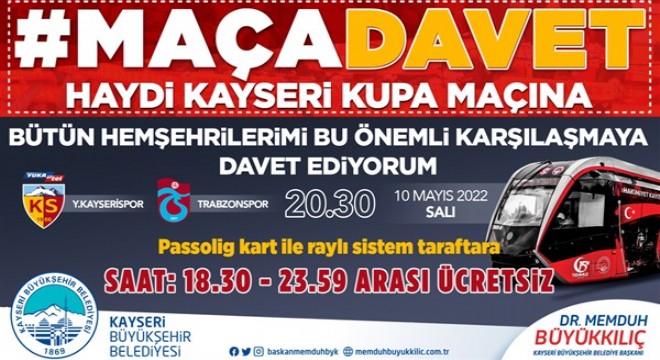Ziraat Türkiye Kupası Yarı Final ikinci maçında rakibi Trabzonspor ile karşı karşıya gelecek olan Yukatel Kayserispor’a destek çıkan Büyükşehir Belediye Başkanı Dr. Memduh Büyükkılıç, 10 Mayıs Salı günü Kadir Has Stadyumu’nda saat 20.30’da başlayacak karşılaşma için taraftarın ulaşımının ücretsiz olması talimatını verdi. Karşılaşma günü belirlenen saatlerde tramvaylarda passolig kartı olan taraftarlar için ulaşım ücretsiz olacak.