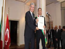 ANKARA / İtalya Cumhurbaşkanı Giorgio Napolitano tarafından verilmesi kararlaştırılan Liyakat Nişanı’nı Büyükelçi Gianpaolo Scarante, Volkan Bozkır’a takdim etti. Büyükelçilik rezidansında gerçekleşen milli gün resepsiyonuna, çok sayıda yabancı misyon temsilcisi ve davetli katıldı. Büyükelçi Scarante, konuşmasında İtalya ve Türkiye arasındaki dostluk ilişkilerinin gelişmesine sağladığı katkılardan dolayı, İtalya Cumhurbaşkanı tarafından bu nişanı Volkan Bozkır’a takdim etmenin uygun bulunduğunu söyledi. Scarante, verilen bu liyakat nişanının bilim, edebiyat, sanat, ekonomi ve kamu hizmeti alanlarında İtalya’ya sunulan hizmetlerin karşılığında verilen bir ödül olduğunu ifade etti. Daha sonra İtalyan Büyükelçi Scarante TBMMDışişleri Komisyonu Başkanı Bozkır’ın yakasına İtalyan Liyakat Nişanı’nı taktı. Resepsiyonun devamında Volkan Bozkır ve Gianpaolo Scarante aileleriyle biraraya gelerek fotoğraf çektirdi. ANKARA /