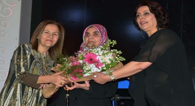Kadınlar Günü pastasının da kesildiği programda kadınların coşkusuna ortak olan Azize Yaşar, tüm kadınlara tek tek karanfil dağıttı.