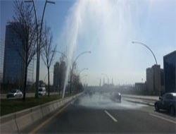 Eskişehir Yolu’ndan Kızılay istikametine ilerleyen sürücüler, refüjdeki çimleri sulamak için kurulan sistemin kendilerine su sıçratması nedeniyle zor anlar yaşadı. Sürücüler şelaleyi andıran suyun altından geçerek yollarına devam etti.