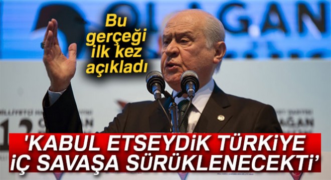 MHP’nin 12. Olağan Büyük Kurultayı, Ankara Arena Spor Salonu'nda gerçekleştirildi. Kurultayın açılış konuşmasını yapan Bahçeli, MHP'nin, başını CHP’nin çektiği PKK, FETÖ karışımı ve haçlı tembihli iktidar oluşumunu reddetmesinin bütün hesapları bozduğunu, planları tarumar ettiğini kaydederek, "CHP’nin Çin malı başbakanlık teklifini kabul etmiş olsaydık, HDP’yi yanımıza yöremize kazara alıp FETÖ’nün tuzağına düşseydik, bilinsin ki, Türkiye iç savaşa sürüklenecek, bekamız hepten, tümden çökecek, çürüyecekti. Düşman evin içine girecek, kaleyi içten yıkacaktı. Bunu yapamazdık, böyle bir vebale ortak olamazdık, nitekim Allah’a çok şükür ki olmadık. Milletin vermediği başbakanlık görevini başka kapılarda dilenerek arayamaz, alamaz, buna tenezzül dahi etmez, edemezdik. Bizim ülkülerimizin fiyatı yoktur. Bizim davamızın bedeli yoktur. Bizim inançlarımızın takası, telafisi, tehiri, ikamesi de asla görülmemiş, görülemeyecektir. Ederi bir dolar olan şerefsizlere verilecek ne bir karış toprağımız ne de bir tek insanımız vardır. Ülkücü olmak zordur, ülkücü kalmak daha da zordur. Ülkücü geçinenlerle, ülkücülükten geçinenlerin, bunlara fikren ve fiilen ortam açanların fitne ve fesatlarına karşı mücadele azmimiz, biliniz ki, pek çoktur, pek fazladır" ifadelerini kullandı.