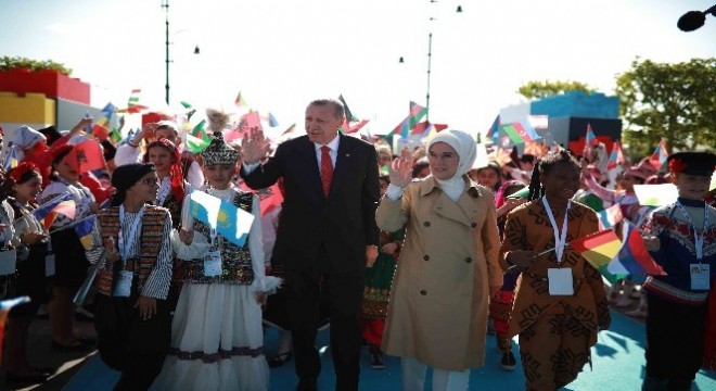 Salonda çocukların coşkusu ile karşılanan Cumhurbaşkanı Erdoğan, çocuklarla bol bol özçekim yaptı. Salonda engelli çocukların bulunduğu alana özellikle giden Erdoğan, çocuklarla burada kısa bir sohbet etti. Sinema ve dizi oyuncusu İsmail Hacıoğlu ve Ayla filminde birlikte rol aldığı Koreli küçük oyuncu Kim Seol ile birlikte sunduğu program Afganistan’dan gelen çocukların sergilediği halk dansları gösterisi ile başladı. 40 ülkenin çocukları da halk dansları gösterilerini salondaki misafirleri sundu.