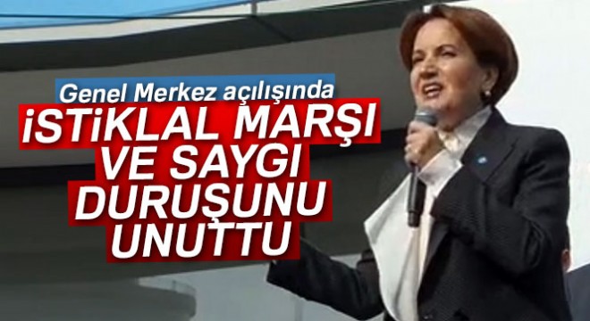 İyi Parti Genel Başkanı Meral Akşener, partisinin Genel Merkez Binasının açılışını yaptı. Akşener’in ismi anons edilirken, Grup Ayna’nın ’Ceylan’ isimli şarkısının müziği çaldı. Akşener, sahneye gelişinde açılışa katılan isimleri selamladı. Selamlamanın ardından saygı duruşu ve İstiklal Marşı’nın okunmasını beklemeden konuşmaya başlayan Akşener, bunun hatırlatılması üzerine konuşmasını yarıda kesti. Akşener’in konuşmasına ara vermesinin ardından İstiklal Marşı okunarak, saygı duruşunda bulunuldu.
