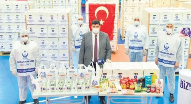 KAHRAMANKAZAN Belediyesi, koronavirüsle mücadele kapsamında topyekûn bir yardım seferberliği başlattı. Belediye, 55 bin nüfuslu ilçede vatandaşlara ücretsiz olarak 30 bin maske, 10 bin hijyen paketi, 6 bin gıda kolisi yardımında bulundu. Bu yardımlar ilçedeki esnaflardan temin edilirken, esnafın kasasına bu kapsamda toplamda 3,8 milyon TL girmiş oldu. Kahramankazan Belediyesi, koronavirüs salgını tehdidi daha Türkiye'de görülmemişken 15 Şubat'ta başlattığı dezenfekte teyakkuzunu hız kesmeden sürdürüyor. İlçeyi tepeden tırnağa dezenfekte eden belediye, mücadelenin sosyal yardım ve maske dağıtımı boyutunda da topyekûn bir seferberlik başlattı.