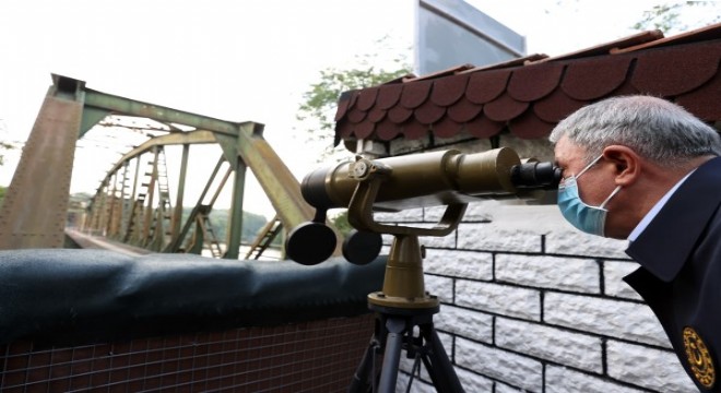 Arda Hudut Bölüğü'nde nöbet tutan Mehmetçikten hudut tekmili alan Bakan Akar, Mehmetçiklerle sohbet ederek dürbünle Yunanistan sınırını inceledi.