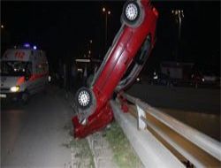 ANKARA / Ankara’da 7 metre yüksekliğindeki köprünün korkuluklarına çarpıp ön kısmı üzerine dik duran otomobildeki 5 kişi, alt yola düşme tehlikesi bulunan araçtan kurtarıldı. Kazada, 1’i ağır 2 kişi yaralandı Ankara-Samsun karayolu Etlik 1011 Kavşağı’nda Gökhan Karagün (38) yönetimindeki 06 R 0716 plakalı otomobil, virajı alamayarak köprünün korkuluklarına çarptı. Çarpmanın etkisiyle otomobil ön kısmından dikildi ve korkuluklara yaslandı. Sürücü Karagün ile Haydar Kemeç’in (24) yaralandığı kazadan, araçta bulunan diğer 3 kişi yara almadan kurtuldu.