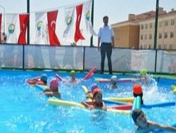 GÖLBAŞI Belediyesi, Park Eymir Konutları Erdem Beyazıt Lisesi bahçesine kurduğu seyyar havuzla 240 çocuğa yüzme dersi veriyor.